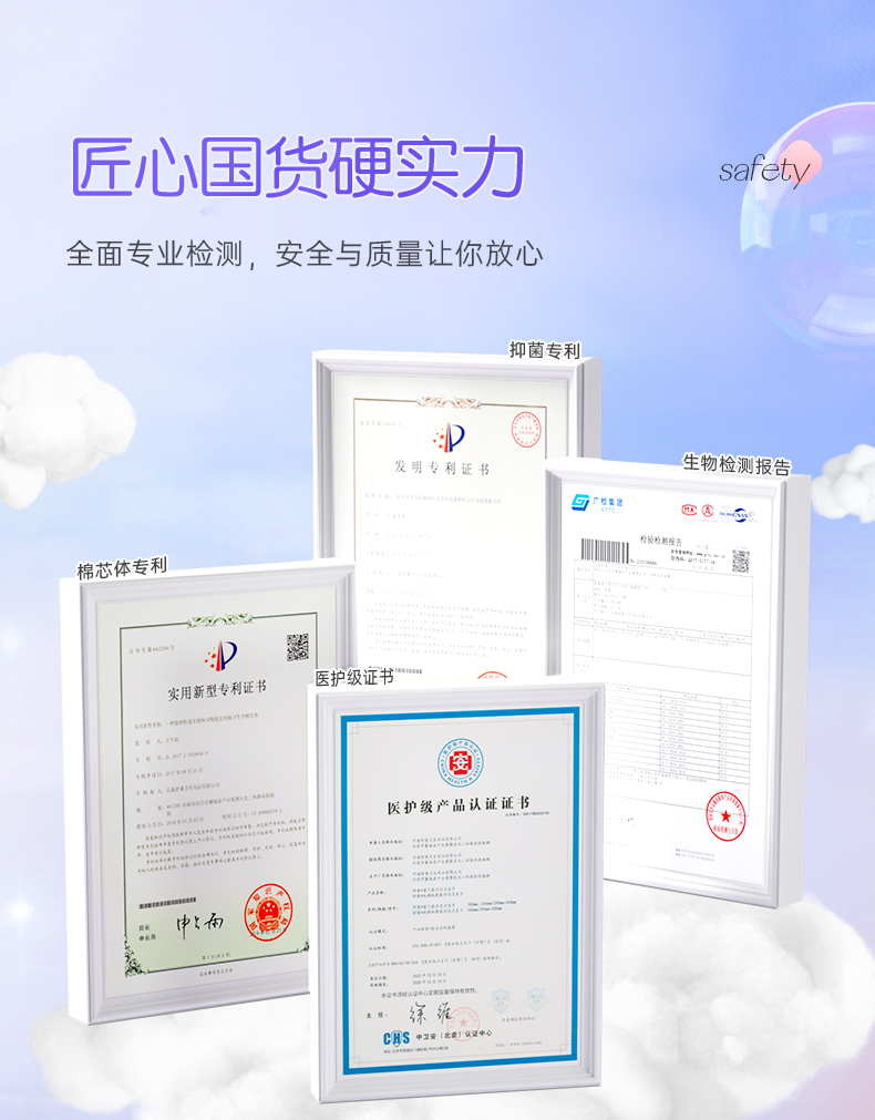 純棉極薄懸浮芯衛(wèi)生巾作為醫(yī)護級衛(wèi)生巾,在產品安全上,多一道48小時醫(yī)用級別環(huán)氧乙烷消毒工序,0真菌更安全,搭配純棉紗織面層和柔軟防漏懸浮芯設計,敏肌女孩也能放心用,讓女性在經期既能享受干爽舒適的極薄親膚體驗,又能有滿滿的安全感,經期潔凈更安心。