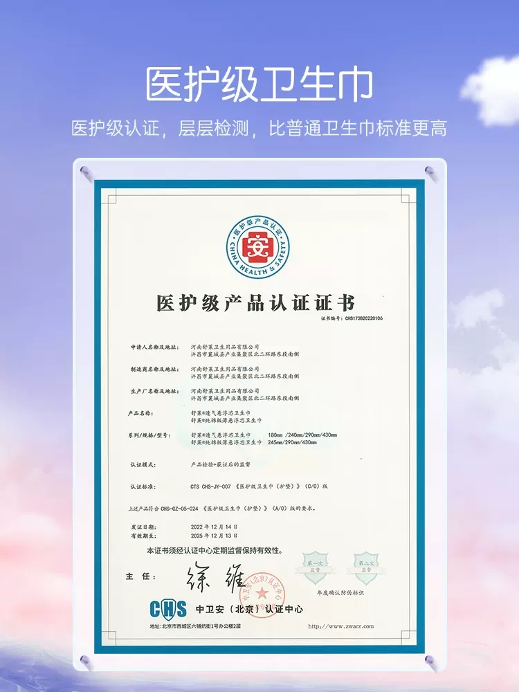 每一次升級都是為了成就更好的產品,每一次突破都是為了更好滿足女性的經期健康需求,這一次,舒萊為了切實給女性帶來生活品質的提升,為女性經期健康保駕護航,讓敏感肌女性也能放心用,舒萊在衛(wèi)生巾上又一次進行了全新升級。升級后的衛(wèi)生巾為醫(yī)護級,是經過衛(wèi)安(北京)認證中心認證的,并且通過了17項指標檢測,產品衛(wèi)生和安全達到醫(yī)學護理級標準,比普通衛(wèi)生巾安全等級更高。舒萊不斷用高標準嚴格要求自己,用醫(yī)護級衛(wèi)生巾和抗菌衛(wèi)生巾呵護女性經期健康。目前,舒萊旗下的透氣懸浮芯衛(wèi)生巾和純棉極薄懸浮芯衛(wèi)生巾已獲得醫(yī)護級認證 。