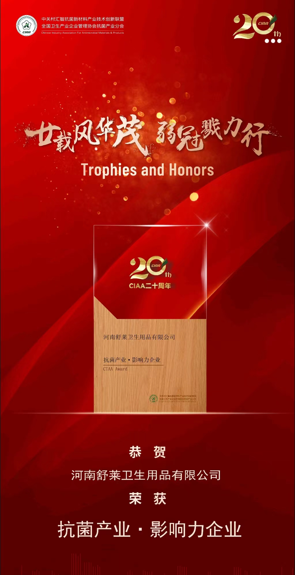 舒萊,慣于用實際行動說話,始終以產品創(chuàng)新為驅動,以科技進步為引擎,不斷進行產品的研發(fā)與創(chuàng)新,在衛(wèi)生巾行業(yè)領域將產品做到極致,并且也在衛(wèi)生巾抗菌領域上成績斐然。近日,在2022年度抗菌標志產品發(fā)布會上,作為衛(wèi)生巾行業(yè)國貨老品牌,憑借過去在衛(wèi)生巾抗菌領域上所做出的成績與努力,舒萊公司榮獲了由中關村匯智抗菌新材料產業(yè)技術創(chuàng)新聯(lián)盟(簡稱CIAA)頒發(fā)的“抗菌產業(yè)·影響力企業(yè)”和“抗菌協(xié)會建設·功勛企業(yè)”獎。