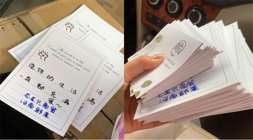 經(jīng)過大家的多方努力與溝通,我們聯(lián)系上了威寧特殊學(xué)校的老師,決定為學(xué)校139位女生送去一學(xué)期的衛(wèi)生巾,不僅準(zhǔn)備了日夜組合裝方便女孩們每周期使用,還很溫暖地在每份禮物里都放入了手寫的愛心卡片,為女孩子們送上美好祝福。