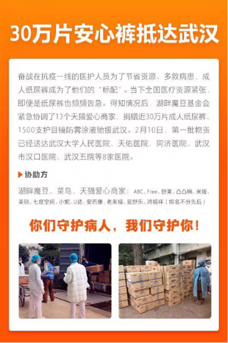 面對武漢紙尿褲物資匱乏,天貓商家與湖畔魔豆向社會緊急籌集三十萬紙尿褲。舒萊收到消息后便立刻發(fā)起了第二次捐贈,盡自己的力量向武漢捐贈了價值五十萬元的安心褲,共計十萬件,占據捐贈總數的三分之一,以解決目前所遇到的緊急問題。只有讓醫(yī)務人員的生活得到保障,醫(yī)務人員才能以更好的狀態(tài)投入到這場抗疫戰(zhàn)爭中。